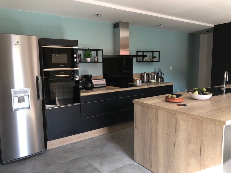 CuisineCuisine contemporaine noir et bois avec îlot central à Mauzé-sur-le-Mignon