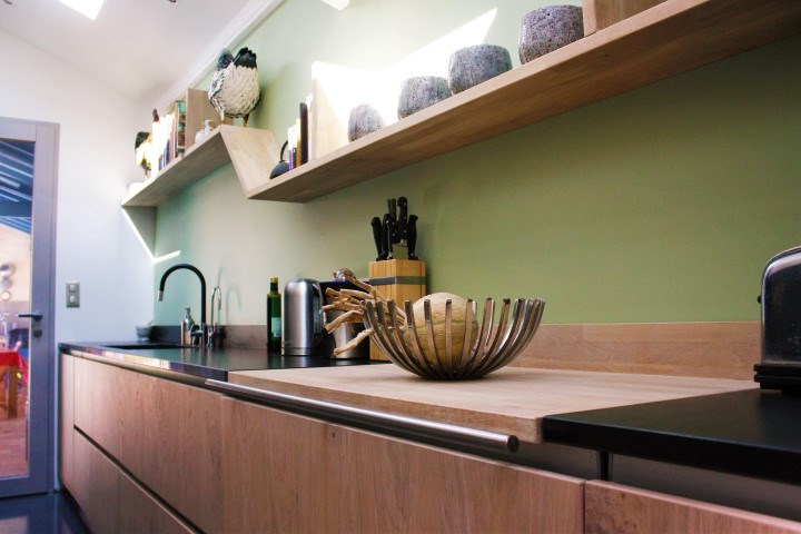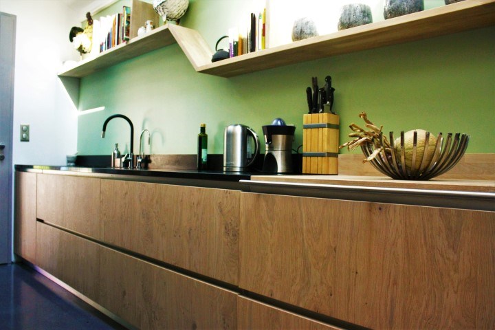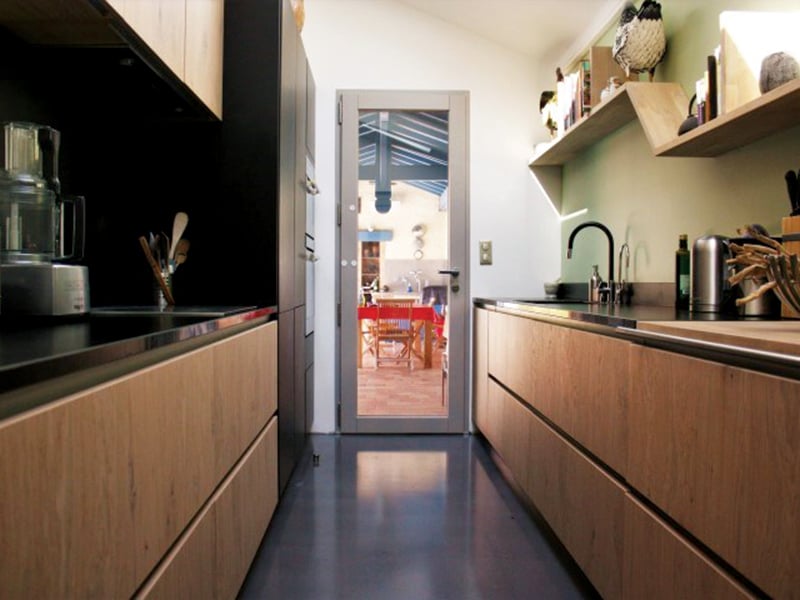Plans de travail stratifié bois qui n'est pas sans rappeler la magnifique poutre ancienne, élément maître de la pièce.