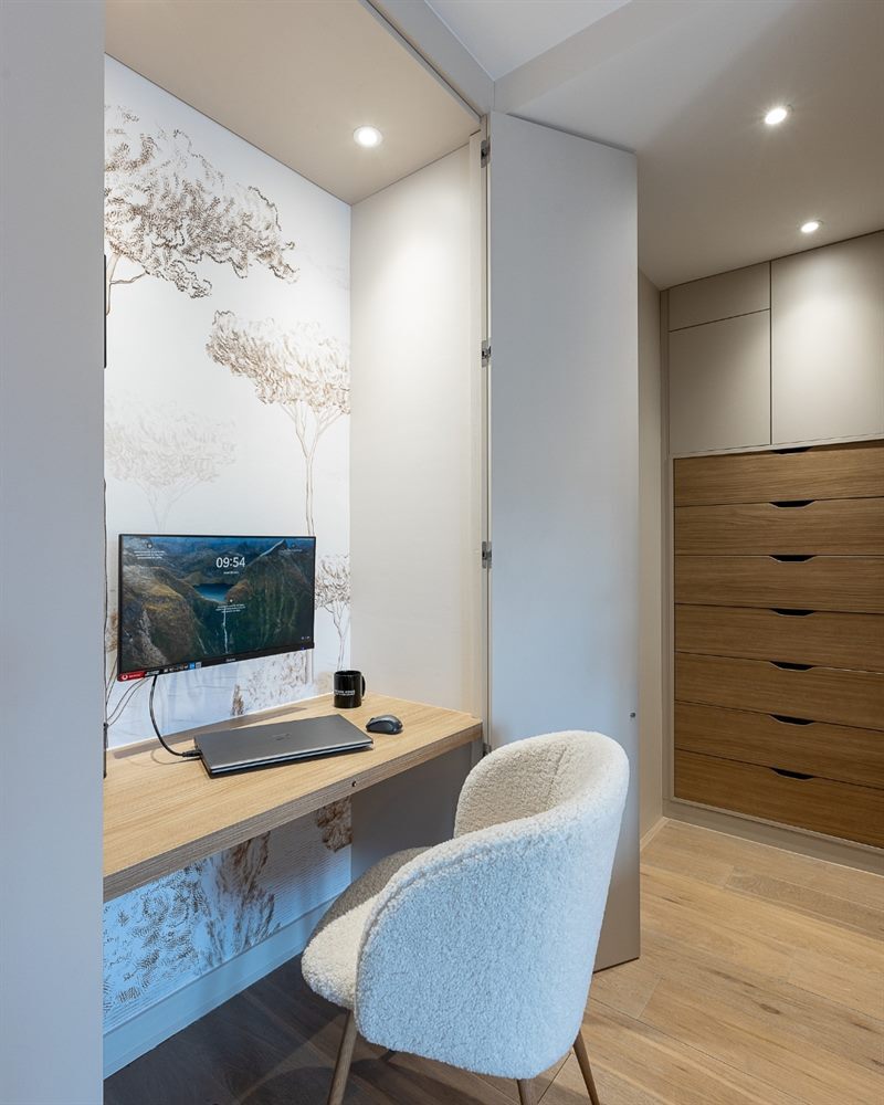 ChambreChambre et dressing avec espace bureau de couleur bois et beige à Versailles