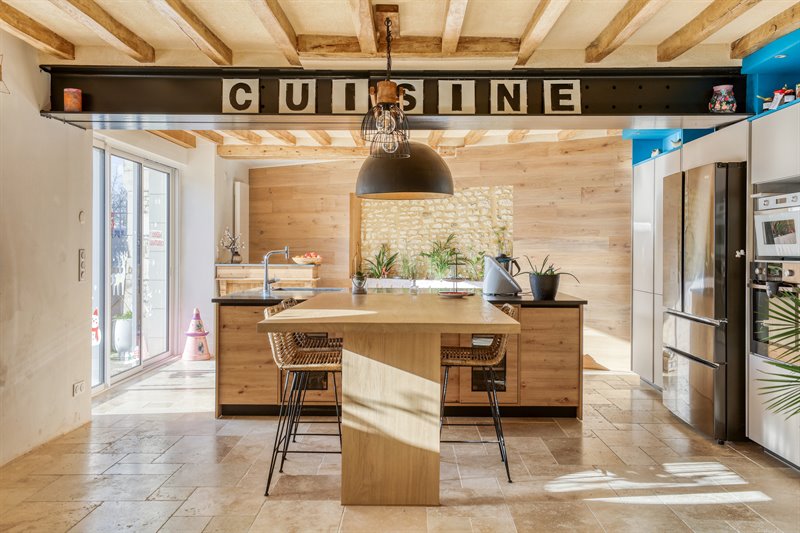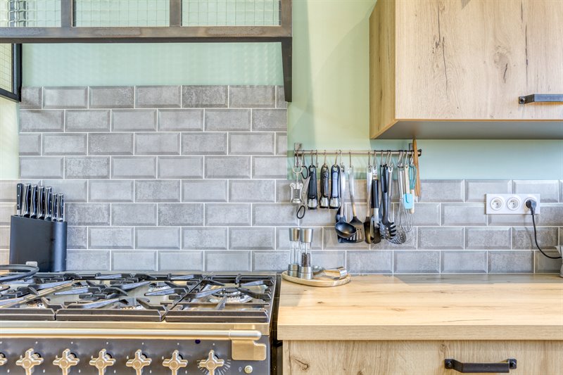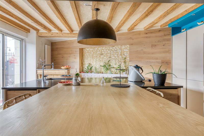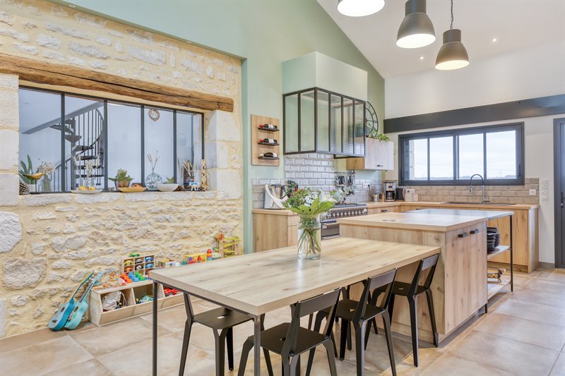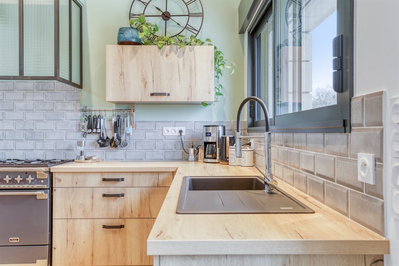 CuisineCuisine ouverte de style industriel bois et noir avec mur vert d'eau à Chauvigny