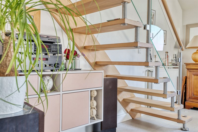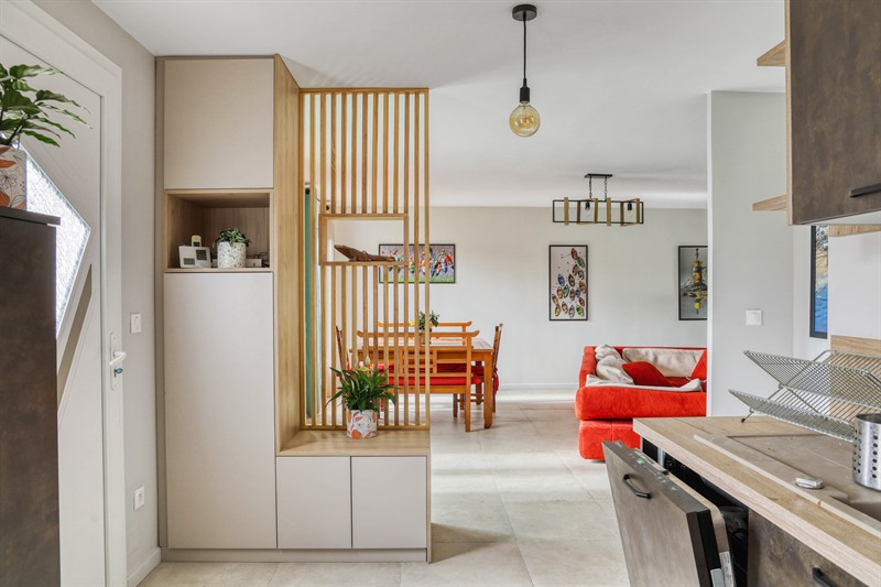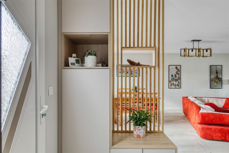 Salon-séjourEntrée avec claustra bois et façade blanche à Montrichard