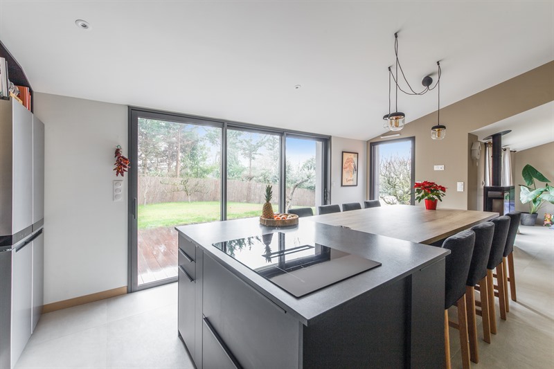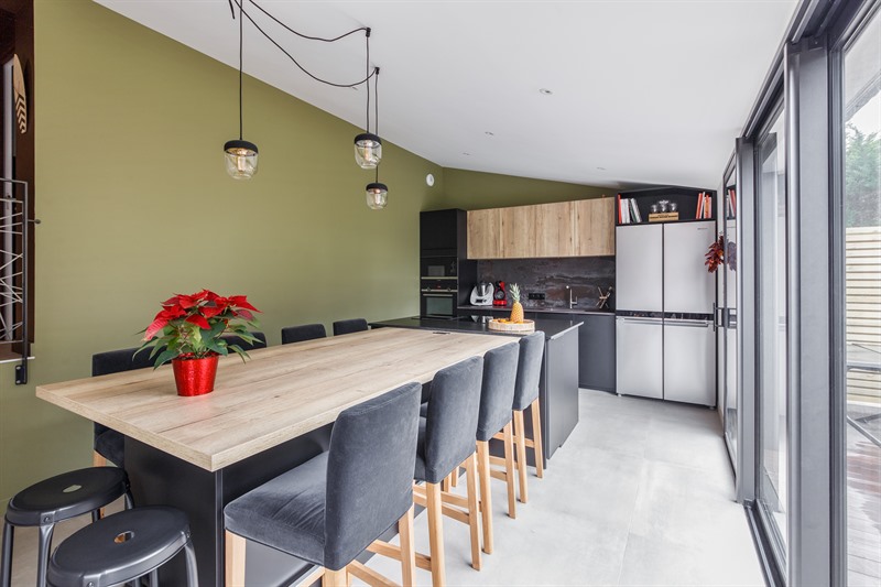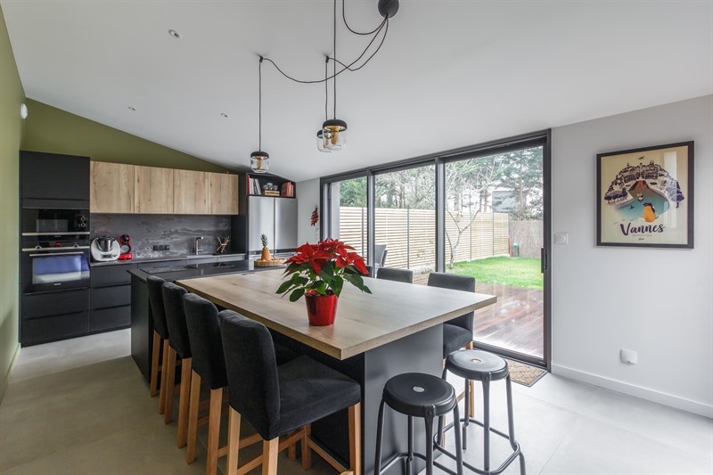 CuisineCuisine moderne avec grand îlot et mur vert olive à Arradon