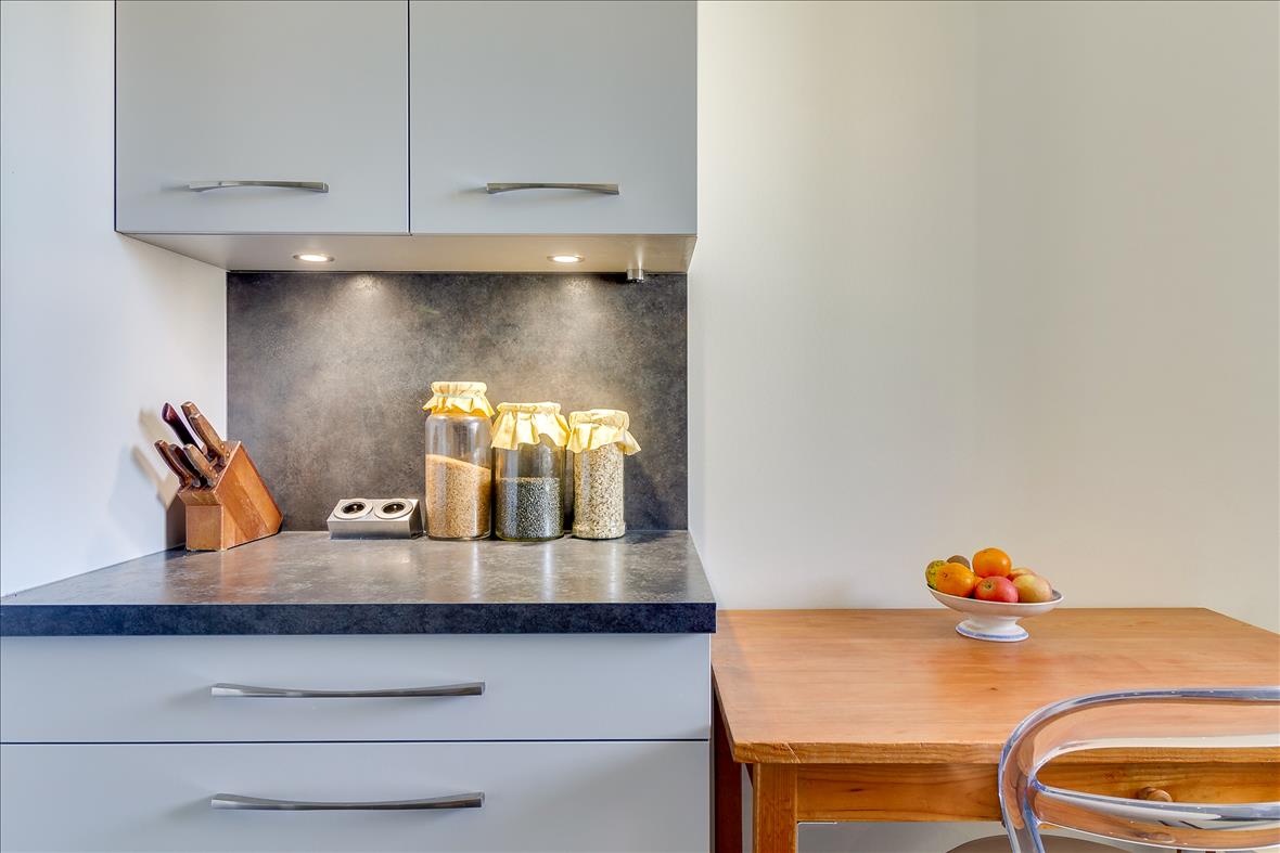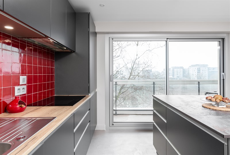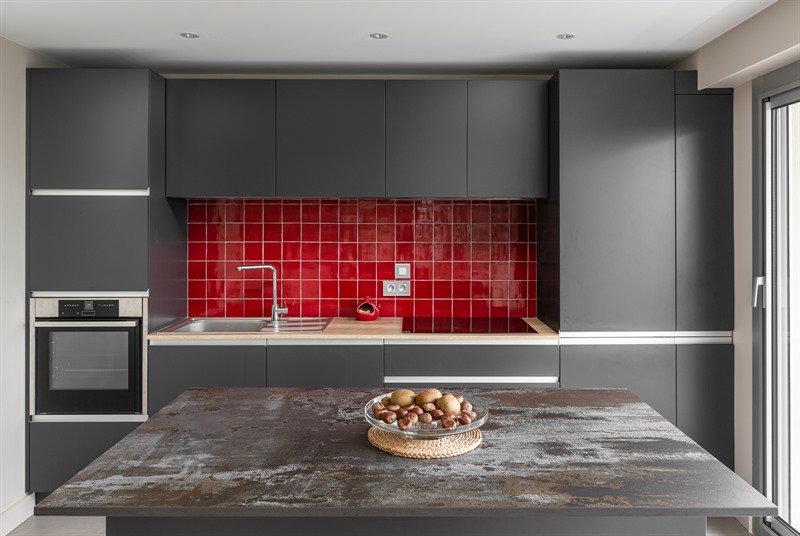 CuisineCuisine moderne grise et crédence rouge à Nantes