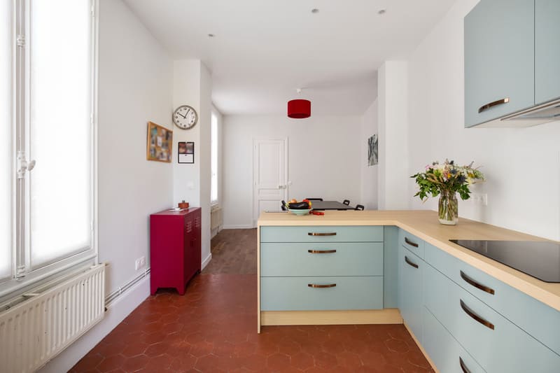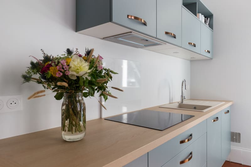 CuisinePetite cuisine vert d'eau et bois à Fontainebleau
