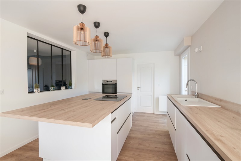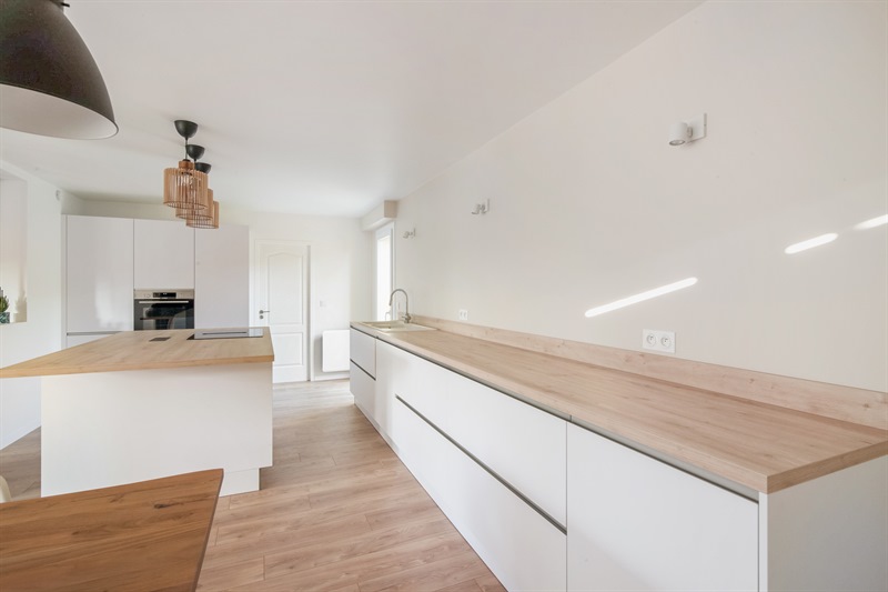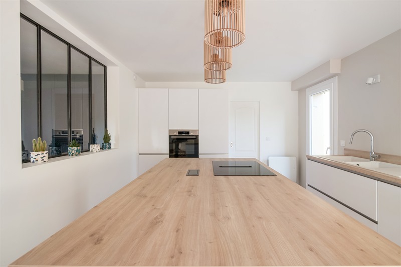 CuisineCuisine blanche et bois avec îlot coin repas à Nemours