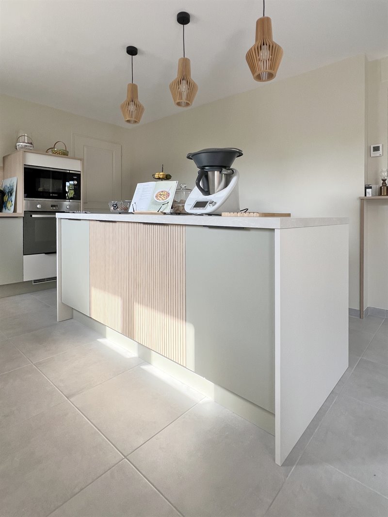 CuisineCuisine avec îlot de couleur bois, blanc et vert d'eau à Beaufort-en-Anjou