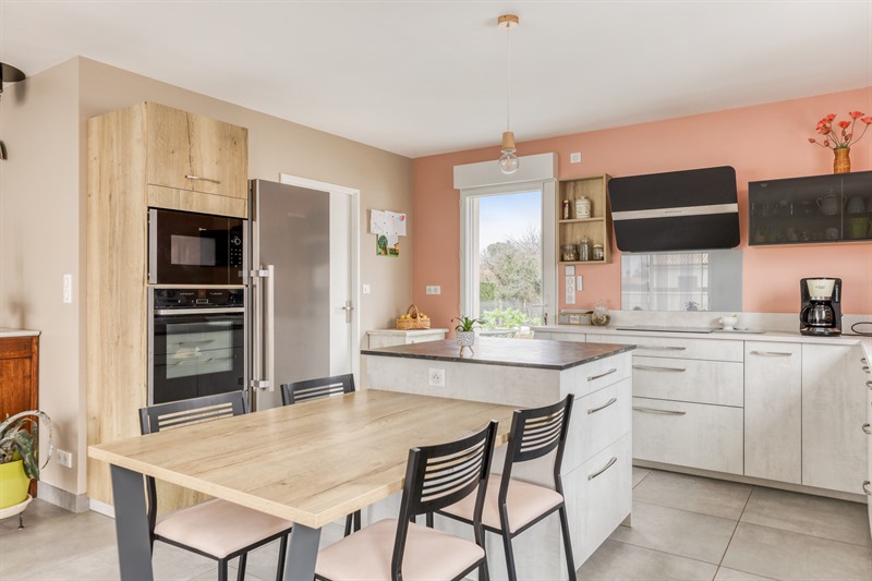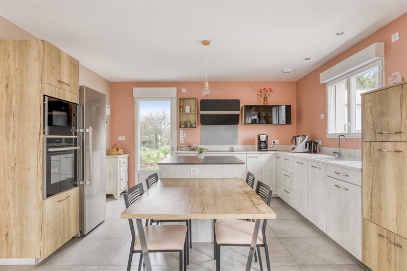 CuisineCuisine contemporaine blanc, bois et noir avec mur rose saumon à Bignoux