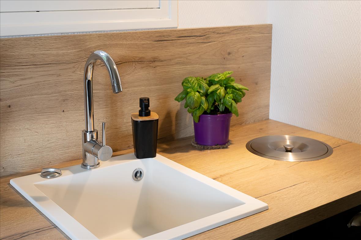 Choix d'une façade structuré chêne associée à un ton silice uni, le tout soutenu par un plan de travail anthracite structuré. Mise en place d'un évier et d'un lave-mains.