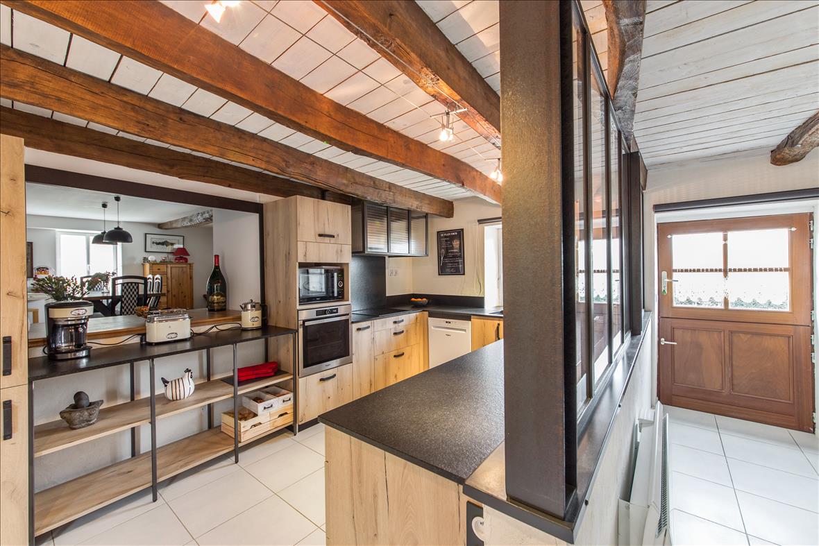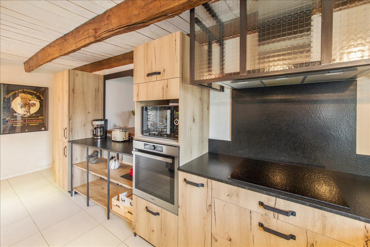 Plans de travail stratifié bois qui n'est pas sans rappeler la magnifique poutre ancienne, élément maître de la pièce.