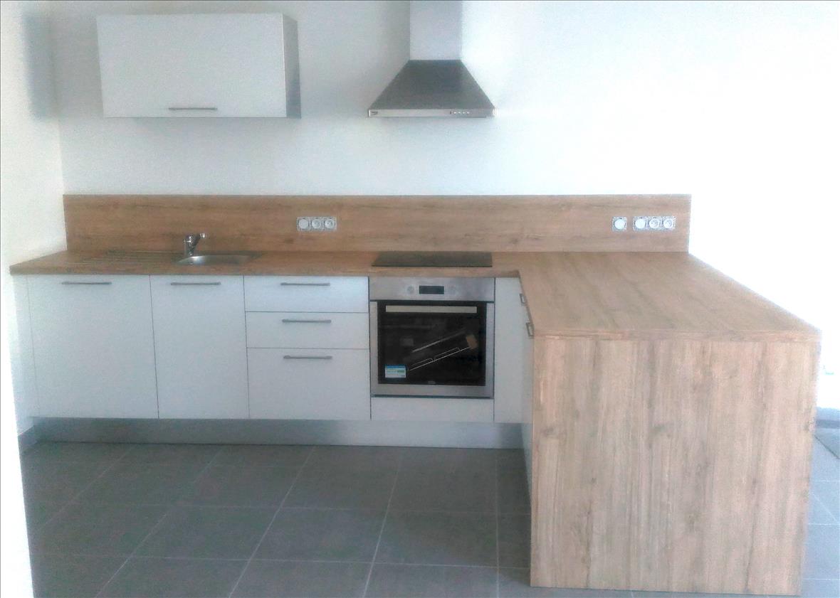 Plans de travail stratifié bois qui n'est pas sans rappeler la magnifique poutre ancienne, élément maître de la pièce.