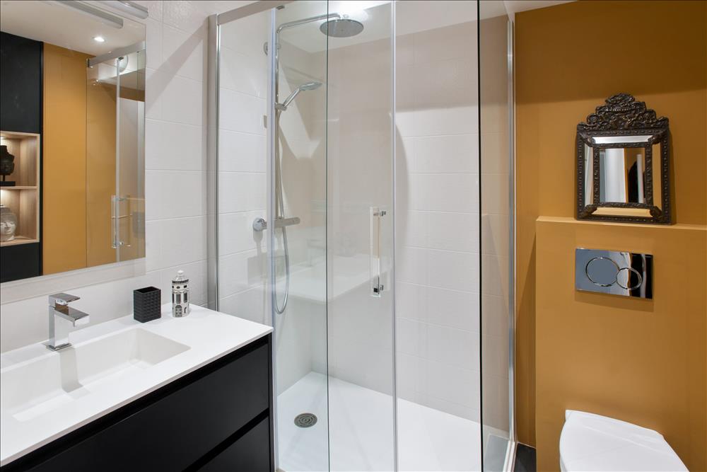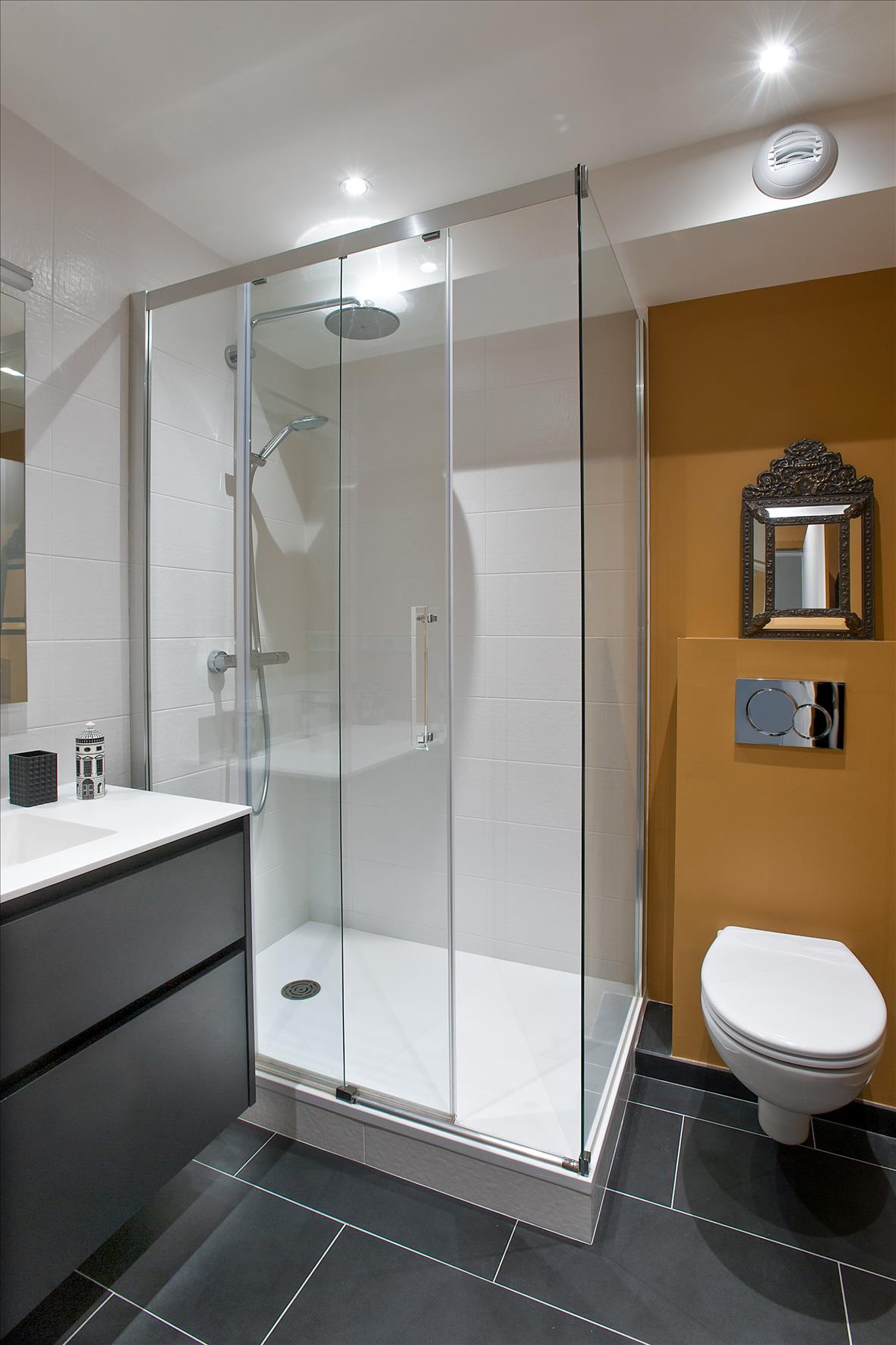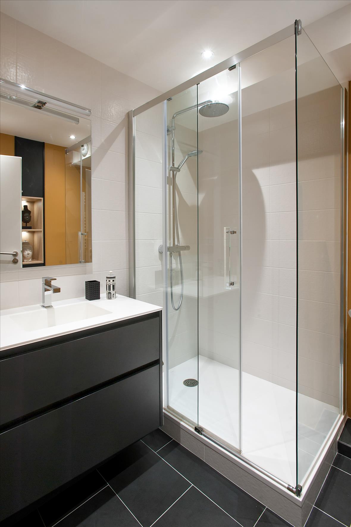 ![]()  ![]()  ![]()   Salle de bain Salle de bainSalle de bains fermée de style contemporain noir à Nantes Salle de bain réalisée par Denis